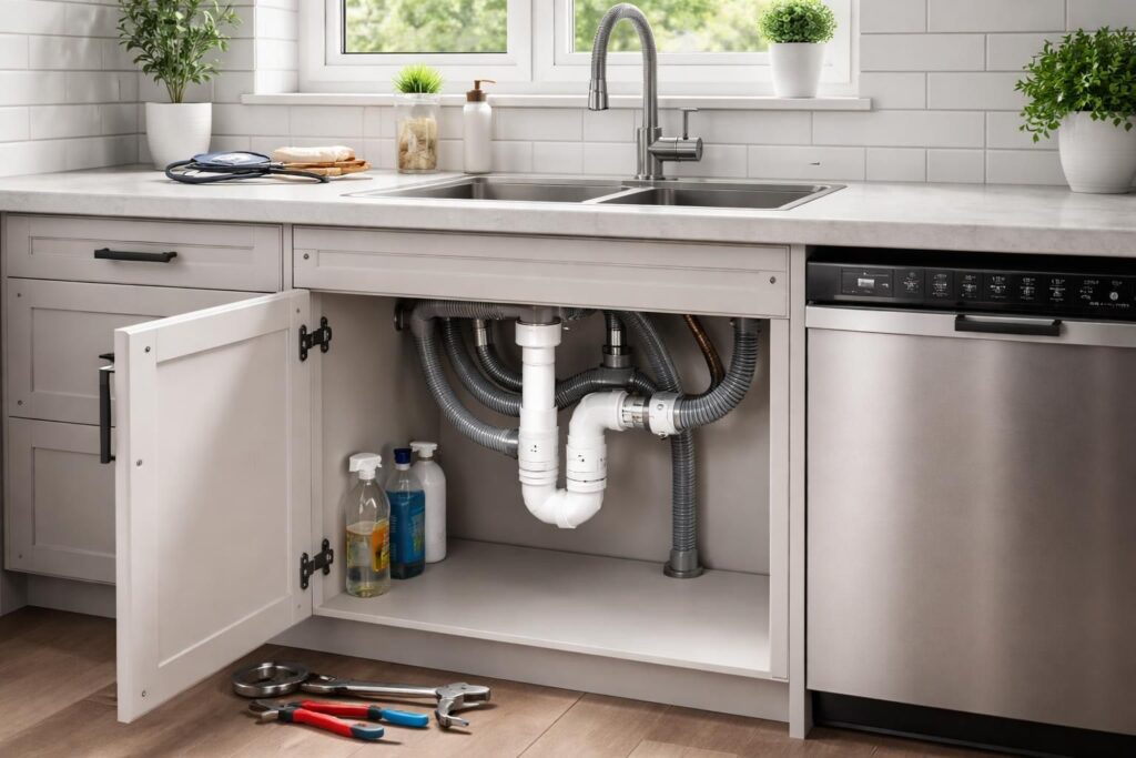 En plus de ces systèmes de prévention des reflux, l’espace sous l’évier doit aussi respecter une certaine configuration pour accueillir le siphon et les tuyaux. Un meuble de cuisine trop encombré peut limiter le bon fonctionnement de votre installation. D’où l’importance de bien planifier cet espace.